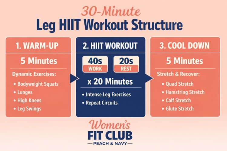 The key to an effective workout is proper structure. A complete 30-minute at-home leg HIIT session includes three parts: