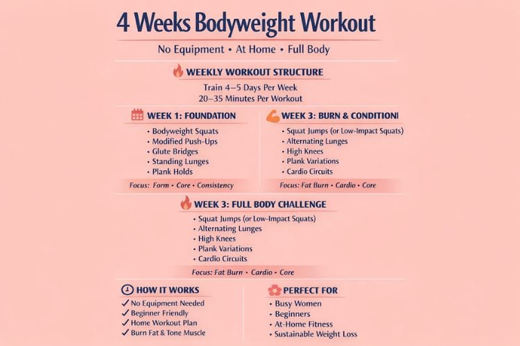 A well-designed bodyweight workout plan uses progressive overload by increasing reps, time under tension, intensity, or exercise complexity each week. Over four weeks, this approach improves strength, endurance, and muscle tone while supporting fat loss.